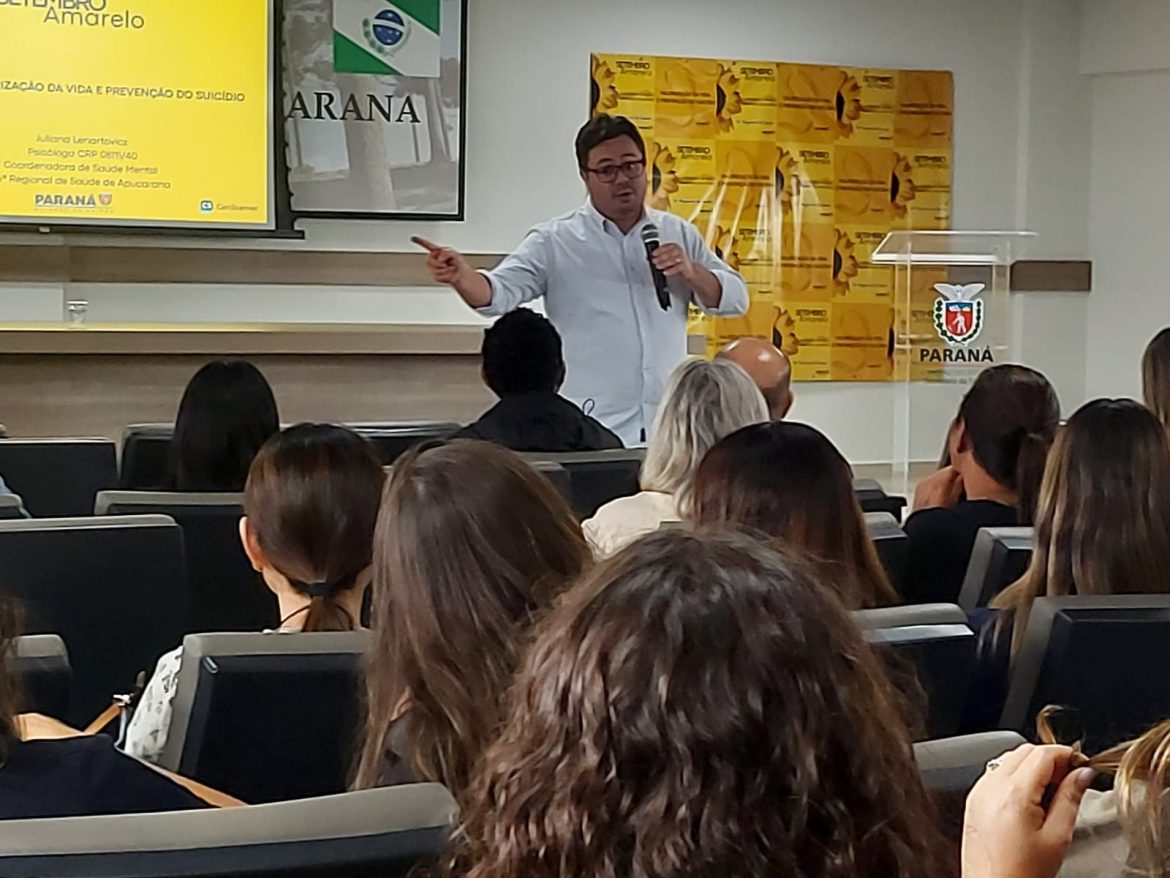 A 16ª Regional de Saúde de Apucarana lançou nesta segunda-feira, dia 22, a campanha “Setembro Amarelo”, que prevê uma atuação mais vigorosa como forma de prevenção ao suicídio. O evento, realizado no Auditório Araucárias, reuniu professores, educadores, diretores de escolas e profissionais de saúde mental, incluindo psicólogos, psiquiatras, enfermeiros e agentes comunitários.