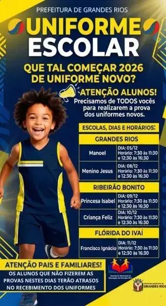 A prova dos novos uniformes escolares em Grandes Rios é um momento muito aguardado. Todos os alunos estão convidados a participar e prometer que tenham as roupas adequadas para o próximo ano letivo.