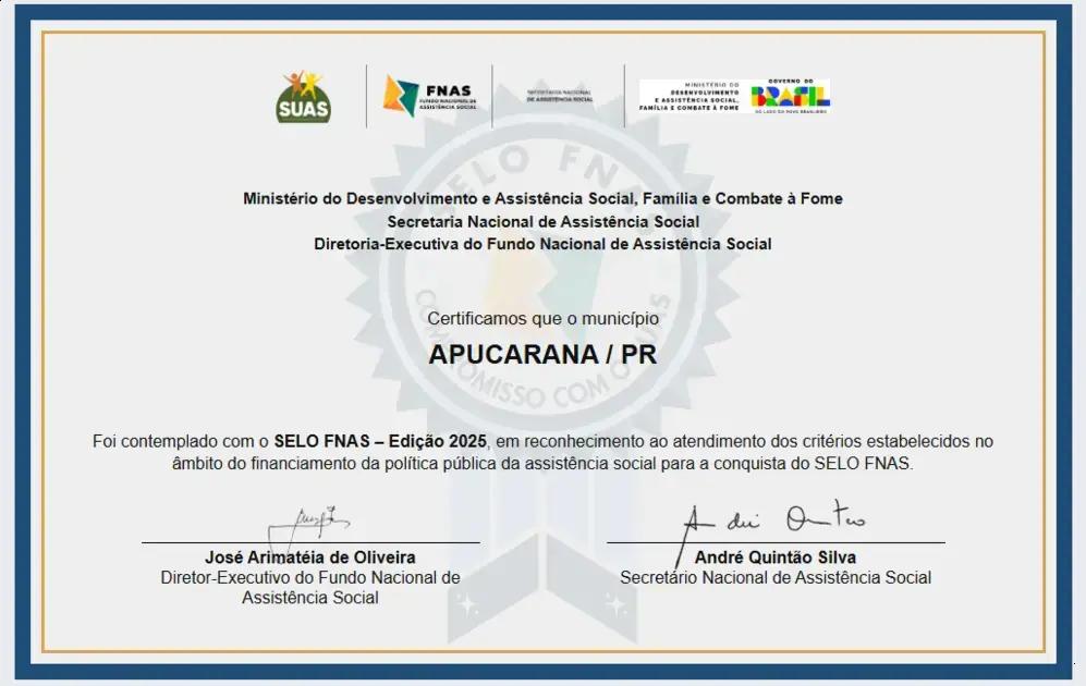 Apucarana foi reconhecida com o Selo FNAS, um prêmio que destaca a qualidade na gestão de Assistência Social. Esse selo é outorgado a cidades que mostram primazia em atender as necessidades da população. A cidade se destacou por sua transparência e eficiência em gerenciar os recursos disponibilizados para a assistência social.
