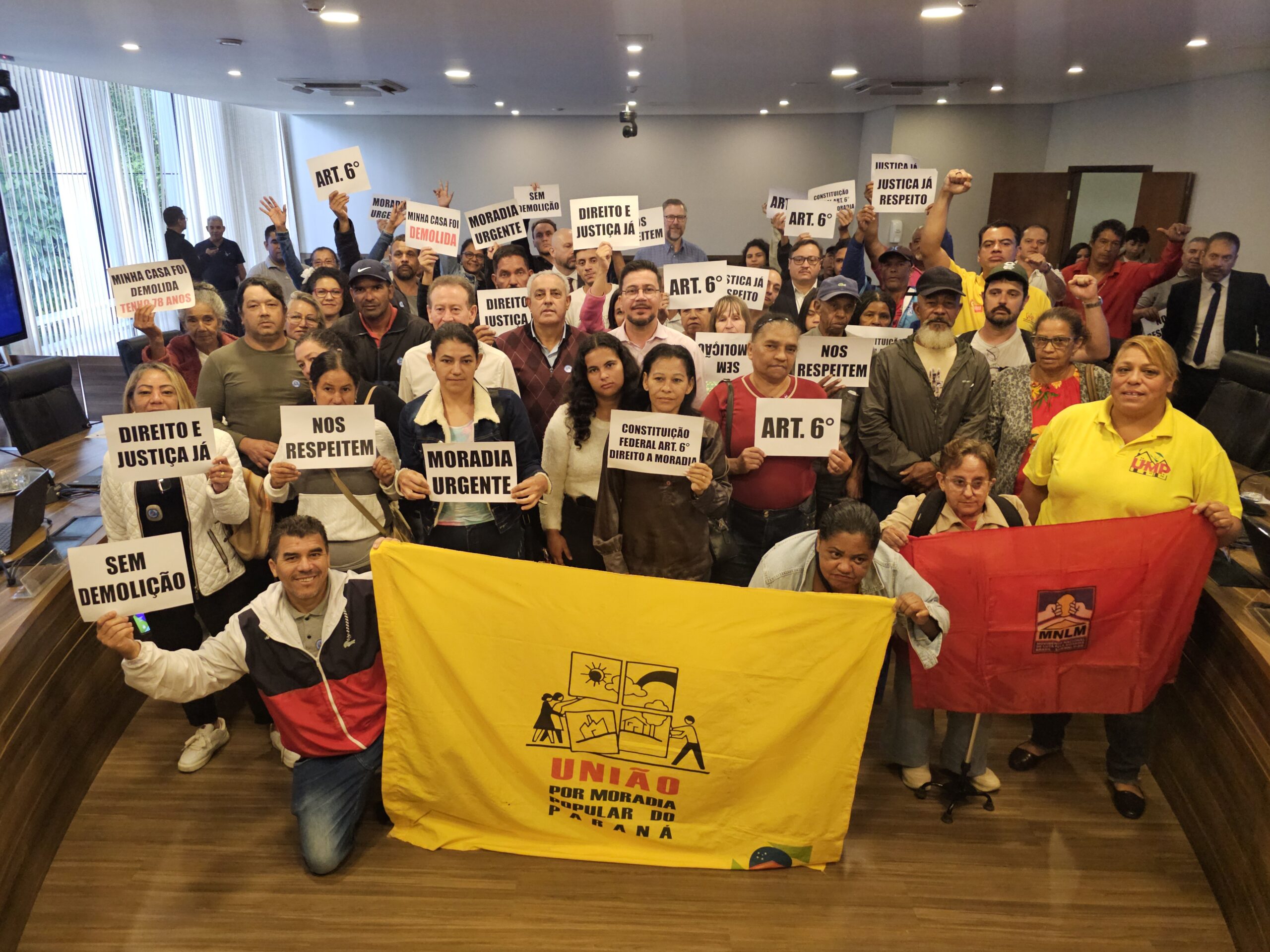 Apesar do tempo pluviátil, o Auditório Legislativo ficou lotado de moradores e lideranças comunitárias que pedem a reversão dos despejos e a elaboração de planos que garantam novas moradias aos atingidos. Eles portavam placas denunciando as demolições e cobrando reverência ao cláusula 6º da Constituição Federalista, que reconhece a moradia uma vez que um recta.