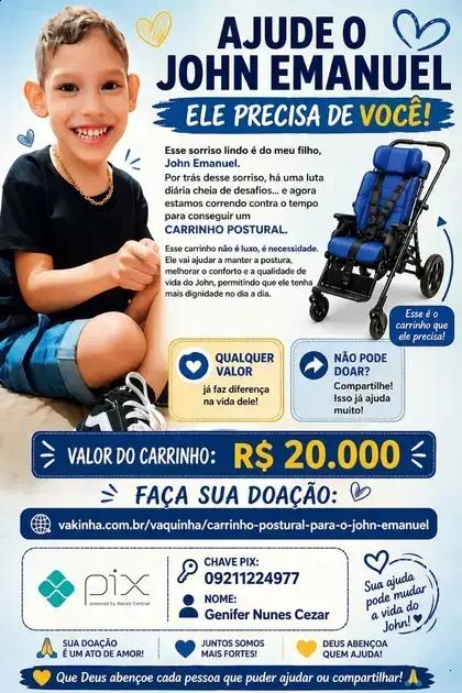 A campanha para o carrinho postural de John Emanuel é uma iniciativa enxurrada de paixão e solidariedade. A família do pequeno John, que enfrenta desafios de mobilidade, decidiu agir. Eles precisam de ajuda para recepcionar fundos e prometer um carrinho que traga conforto e qualidade de vida para ele.