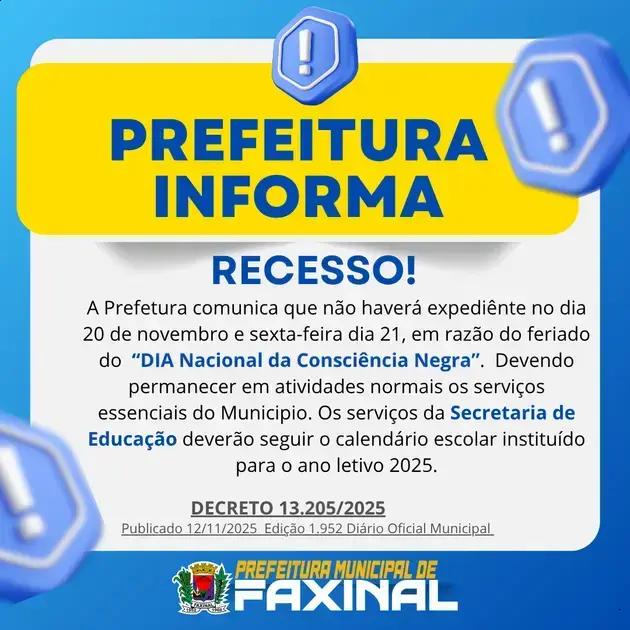 A cidade de Faxinal decidiu declarar ponto facultativo na sexta-feira, logo em seguida o feriado da Consciência Negra. Essa medida visa proporcionar um sota extra para os cidadãos e funcionários públicos. Feriados são momentos importantes e podem ser usados para relaxar e passar tempo com a família.