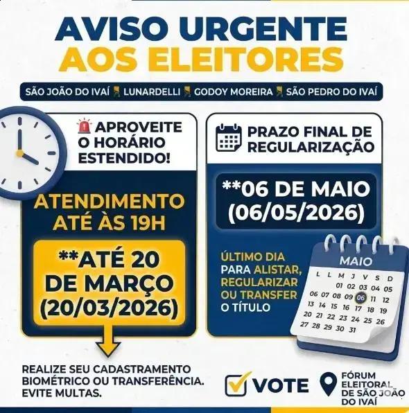 Rol eleitoral está com os prazos apertados em São João do Ivaí. Se você ainda não garantiu seu título, não perdida tempo!