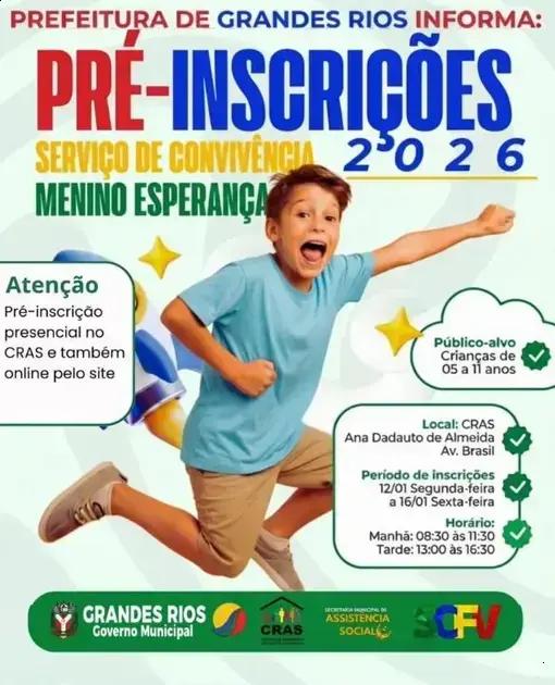 As pré-inscrições para o Serviço de Convívio Menino Esperança 2026 acontecem entre os dias 12 e 16 de janeiro em Grandes Rios. Levante projeto é uma oportunidade incrível para crianças e adolescentes. Cá, eles podem se envolver em várias atividades educativas e recreativas.